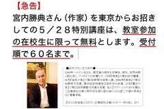 【6月7日<土>】東京から小林龍之さん(文芸編集者)を招いての公開・特別講座に教室聴講55名。文校出身作家の朝井まかてさんと木下昌輝さんも。ほかに昼間部チューター2名、在校生35名(うち春の新入生5名)、休学生6名、修了生5名、一般5名■Zoom視聴49名(うち新入生14名)