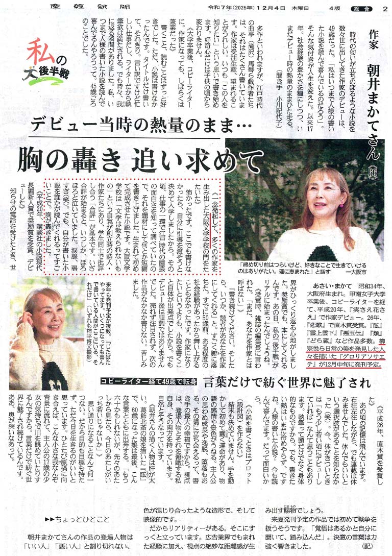 【12/4産経新聞・夕刊】・・朝井まかてさんが、文校入学前から、デビュー・直木賞受賞を経て、今の小説執筆時の心境まで、大いに語る★12/14通教部スクーリングでの朝井さんの40分講義は、昼・夜間部生も500円で聴講可