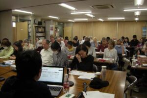 ※講座が始まる前、学生委員会の林隆司委員長(夜・大西クラス)から、明日(12日)の新入生歓迎・文学散歩“大阪天王寺界隈+2次会”の参加呼びかけと学生委員の勧誘がおこなわれました。