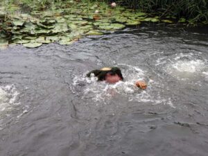 ■貸し切りバスにて「文珠荘」を出発し【写真⑪⑫】、同じ福崎町にある柳田國男記念館へ。建物の外には、沼から浮き上がってくる河童【写真⑬⑭】や、飛び出す天狗もいて子供たちに人気でした。柳田國男の生家は田の字型間取りで「日本一小さい家」と自ら言われていたように、コンパクトな農家といった風情です。自分が住んでいた家とは違うのに、なぜか懐かしい。