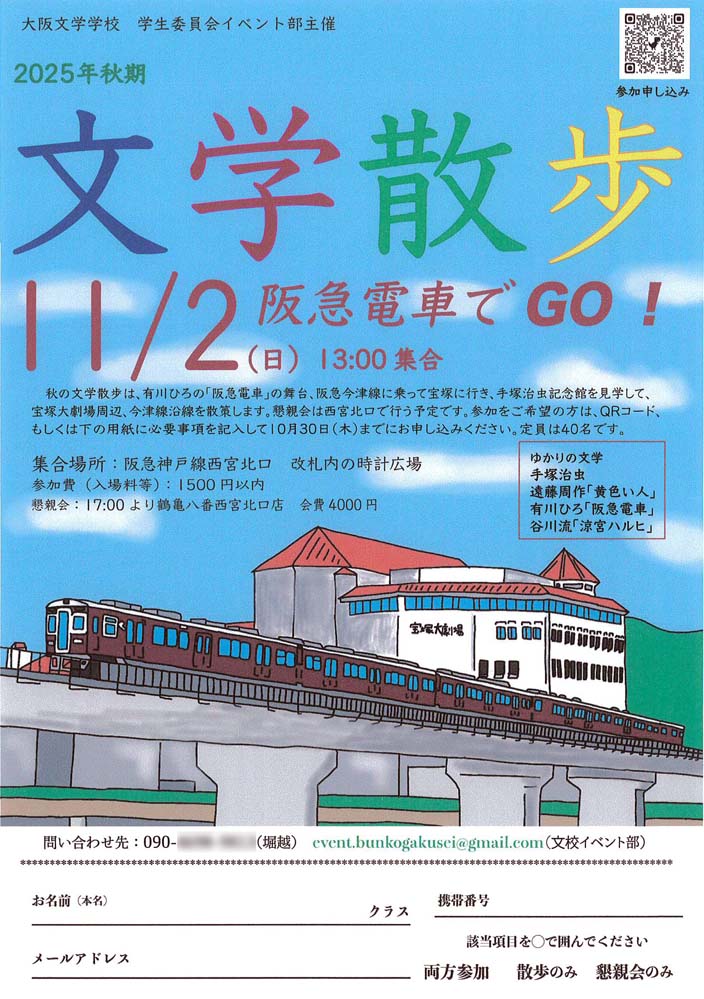 申込は、文学散歩を主催する学生員会イベント部あて、QRコードかメールか電話で。