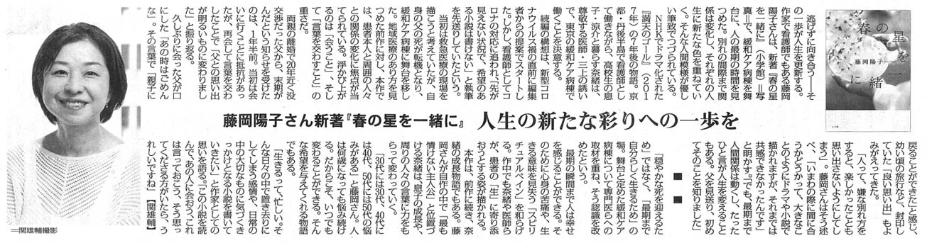 【9/29「毎日新聞」夕刊・文化面】・・藤岡陽子さん(作家・文校修了生)の新刊『春の星を一緒に』<小学館/1,980円>が紹介される!