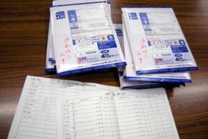 【写真】通教部各チューターへ発送される通教部生の作品の“山”。あわせて、「作品提出リスト」「過去の作品提出状況表」「入学申込書」(新入生・進級生のみ)も同封。