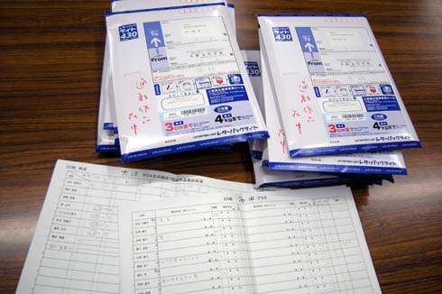 きょうまでの到着作品をクラスごとにまとめました。まもなく道頓堀に近い大阪南郵便局に出向いて、通教部12名のチューターに速達で届けます。
