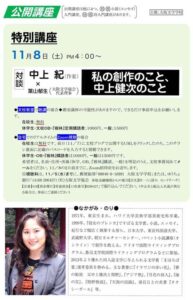 11/8(土)、東京から中上紀さん(作家)をお招きしての公開/特別講座【私の創作のこと、中上健次のこと】★在校生は教室聴講・Zoom視聴とも無料★休学生・OB・『樹林』定期購読者は1000円★一般は1500円