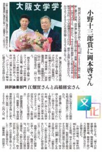 ◎小野賞を主催しているのは、大阪文学学校の運営母体である一般社団法人・大阪文学協会(代表理事;葉山郁生)。小野十三郎さんは、大阪文学学校創立の1954年から91年まで校長を務め、96年10月に93歳で亡くなるまで名誉校長でした。