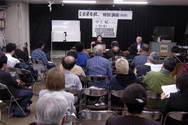 文校の運営母体である大阪文学協会の葉山郁生・代表理事が、小説集『熊野物語』を中心に中上さんの著作を紹介・分析するのに応え、中上さんは創作意図などを存分に語られました。