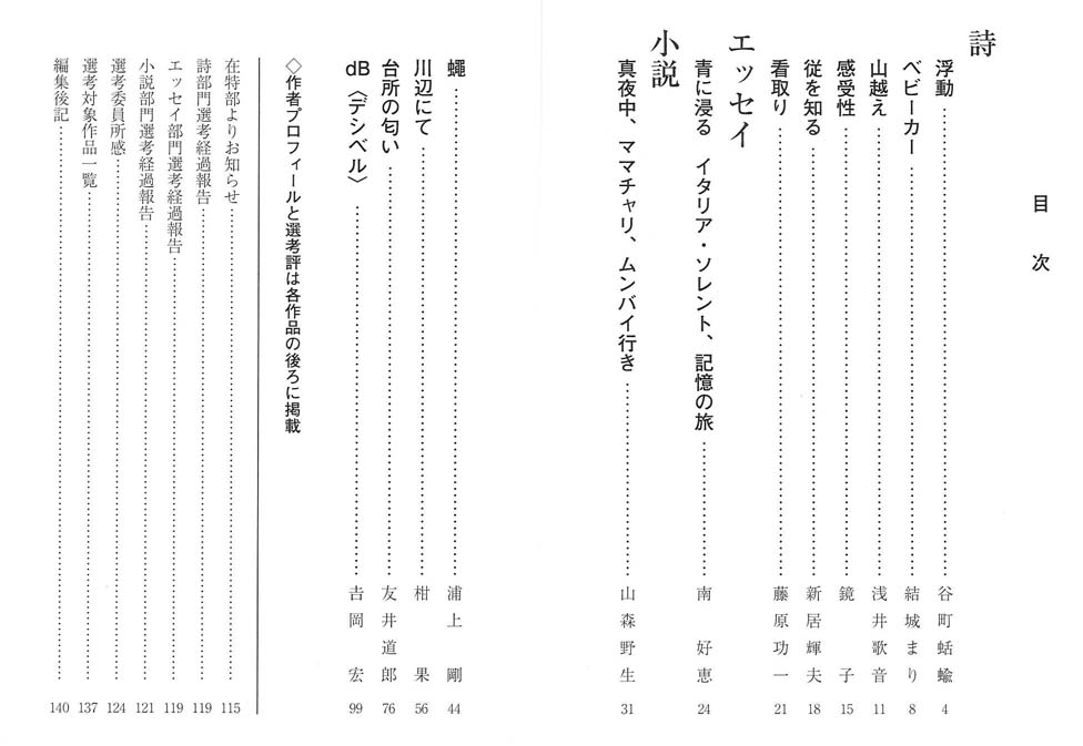 今回の11月号には、詩6編、エッセイ1編、小説5編の在校生作品が収められています。各選考委員の選考評なども含めて総140ページ。