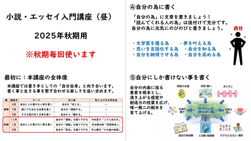 ●11/17(月)午後6時30分からも公開講座があります。作品提出+聴講で1000円いただきます。