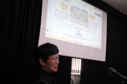 【柔らか語り口ながら熱も帯びる馳平啓樹(はせひら・ひろき)さん。後方のスクリーンに自作のテキストを写し出す】
