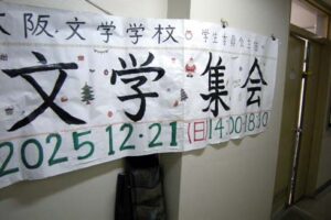 学生委員会主催の“12/21文学集会2025”。そのPRのために大型の横断幕を廊下に張り出しました★【クラスからの模擬店】を募集中!★第2教室に張ってある【模擬店一覧表】に記入を!