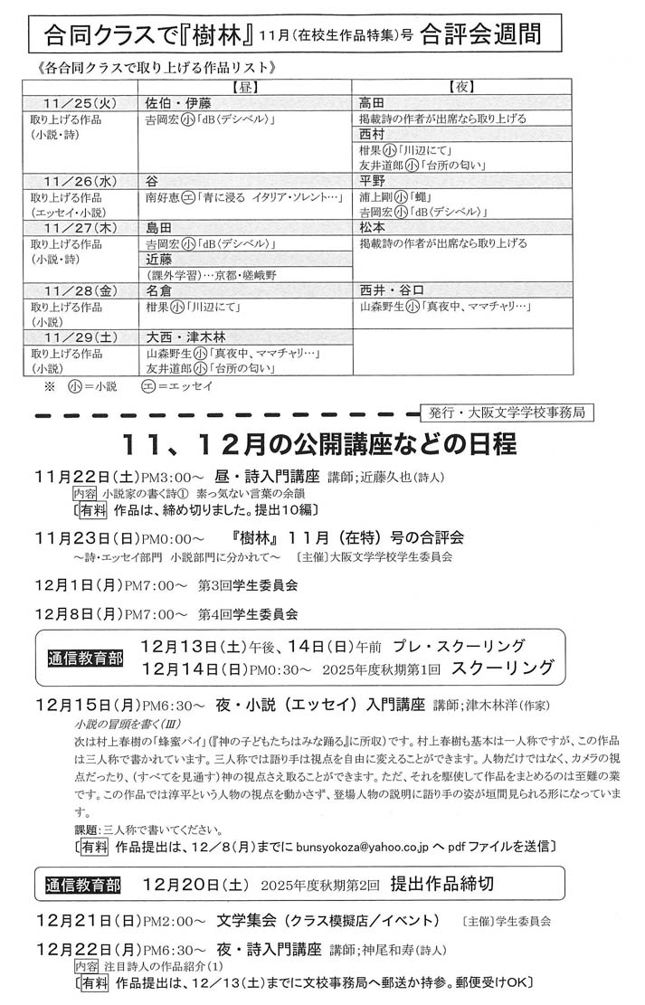 ★来週(25日~29日)の昼・夜間部は、合同クラスで『樹林』在特(11月)号・合評会週間★23日(日)は学生委員会主催の『樹林』在特(11月)号の合評会★通教部生は、12/14スクーリング・出欠ハガキを急いでください!