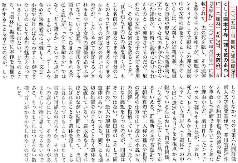 【夜間部専科・休学中の岡本千尋さんの「誰そ彼のあわいに」(58枚)が載っている『樹林』2024年11月号は在校生作品特集号。その作品は、まず第45回(25年度)大阪文学学校賞<小説部門>の佳作[賞金3万円]に選ばれ、さらに25年上半期同人雑誌優秀作[奨励金10万円]として『文學界』25年6月号に転載された】