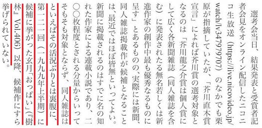 『季刊文科』101号・・・●『樹林』掲載の玄月「おっぱい」<芥川賞候補>と岡本千尋「誰そ彼のあわいに」<『文學界』転載>が話題に●『樹林』在特号などから在校生、所属同人誌からチューターや修了生の小説が取り上げられる