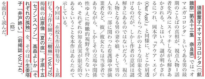 【◎須藤薫子さんは通教部チューター。同人誌『飢餓祭』には文校修了生や在校生ががつどっている ◎山原倫さんは夜間部休学中、才原十五さんは夜間部・谷口C、高森よしかさんは昼間部・伊藤C。『樹林』Vol.712(25年5月号)は在校生作品特集号 ◎生姜塔子は通教部・飯田C。『樹林』Vol.714(25年7月号)は通信教育部作品集】