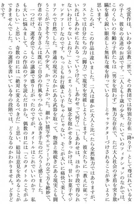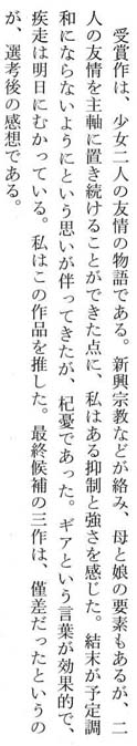 ●小説すばる新人賞の選考委員は、五木寛之・北方謙三・辻村深月・宮部みゆき・村山由佳(五十音順)の五氏です。五氏それぞれが最終候補作3作について書かれた《選評》のうち、「ギアをあげた日」の箇所のみ、次に抜粋します。