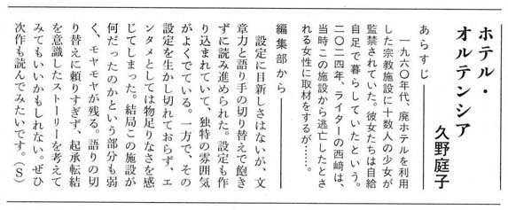 ●『小説すばる』12月号には、“新人賞応援企画!<編集部からのアドバイス>”のコーナーがありました。「編集部から特にひと言お伝えしたい」15作品の中に、久野庭子さん(昼間部・大西C)の3次選考通過の作品「ホテル・オルテンシア」(480枚)も入っていました。