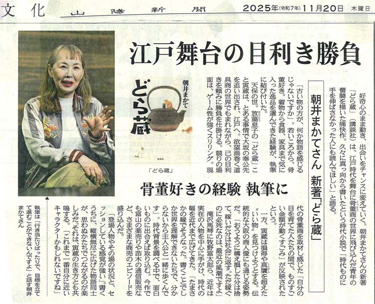 岡山県の84歳女性(文校通教部・小説クラス3年)が、11/20山陽新聞に載っていた“朝井まかてさん新著『どら蔵』”の記事を封書で届けてくれました★朝井さんは12/14通教部スクーリングで講義し、著書の販売・サイン会も予定