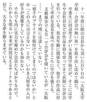 ここに出てくる「大阪文学学校・合評会の熱い夜」というのは、2009年2月中旬の土曜日、夜10時台、30分にわたって“合評会の熱い夜~大阪「小説は人生や」”と題して文校のことがNHK総合テレビで全国放映されたことを指しているようです。