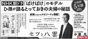【今朝(19日)の朝日新聞・2面】朝日新書『セツと八雲』(著者・小泉凡/聞き手・木元健二)の広告がデカデカと。10刷5万部を突破!★木元チューターは3/8スクーリングで講義「出会いの魔力―セツと八雲、色あせぬ怪談の妙」