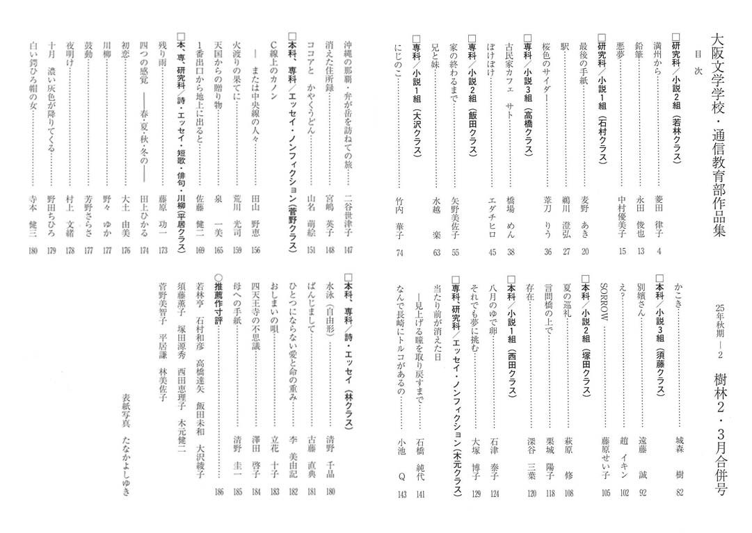 『樹林』2・3月合併号は、3/8(日)通教部スクーリングの合評テキストになります。該当クラスの作品をしっかり読んで、合評会に臨んでください。感想をメモしておくことをおすすめします。
