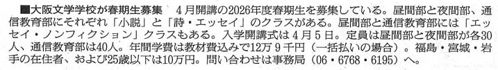 昨夕(2/25)の朝日新聞・・・文化面〈2面〉に“大阪文学学校・春期生募集”の記事★今日までに、24歳から77歳まで10名が入学手続き。通教部には、愛媛県松山市、愛知県東海市、同額田郡、東京都渋谷区などから。